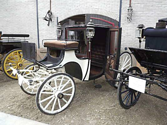 Brougham Coupe. Bouwer; H.J. Overmijer & Zn. Bouwjaar; 1880. Herkomst; Amsterdam Opmerking; de oude bekleding en de ronde ruit aan de voorzijde. Brougham Coupe. Dit is een restauratie object,deze koets is van Arie Hak geweest. Arie was een medeoprichter 50 jaar geleden van Glijen en Rijen. |