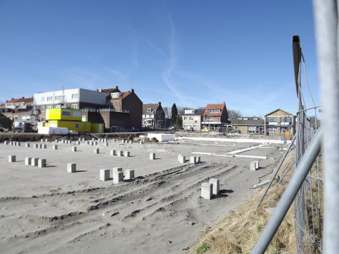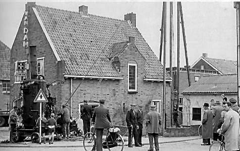 Plantageweg. Waar nu de Schuilplaats is zat vroeger Adrianus van Dijk met huishoudelijke artikelen. (verder op komen we hier op terug.) En in de hoek zat A.Visser schoenhandel. (zie kerkstraat) 29-07-1954. De eerste paal gaat de grond in voor A.Visser schoenhandel. |