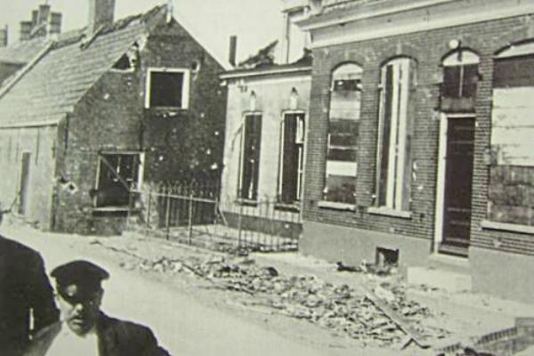 Links het huis van Letta Ritmeester. In het midden Wim Verhoeff. Rechts A van Dijk. Dam Kruidenierswaren. Aletta Ritmeester begon naar het overlijden van haar man een winkel van sinkel. Dam 15 Huishoudelijke artikelen en speelgoed. Adrianus van Dijk begon in 1935 een winkel in huishoudelijke artikelen. Bij het bombardement 1940 werd het pand flink beschadigd. In 1954 verhuisde ze naar de Plantageweg 13. In 1990 is de winkel gesloten. Sinds 2006 zit daar de christelijke boekhandel De Schuilplaats. |