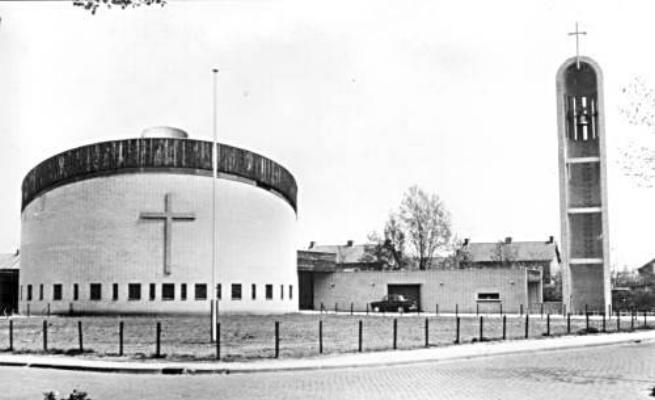 Parallelweg. R.K.Kerk. 21-05-1966---De eerste steen wordt gelegd. 17-12-1966---De bisschop van Rotterdam monseigneur M.A.Jansen wijdt de nieuwe R.K. Fatimakerk in. |