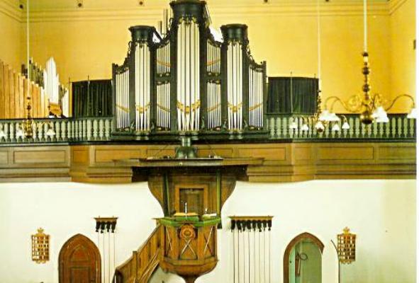 Herv kerk interieur en orgel gerestaureerd en preekstoel in de oude situatie. |
