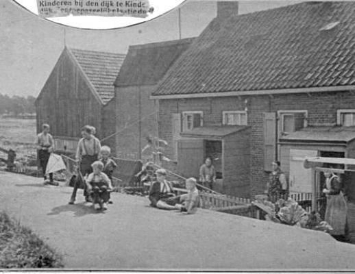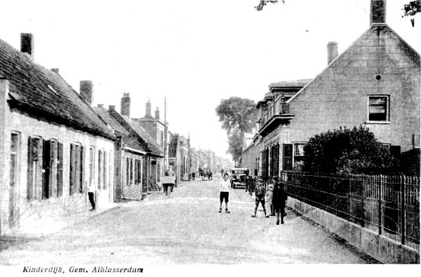 Westkinderdijk 185. Het vijfde pandje van rechts (met afgekant dak) was de smederij van Jan de Wit later van Quispel. Links ervan met rieten dak boven aan de molenkade de kruidenierswinkel van Aafje Steenis. Op de voorgrond de boerderij van Oostrom. Na het rijtje huizen links was de werkplaats van schoenmaker Hannes Vogel. |